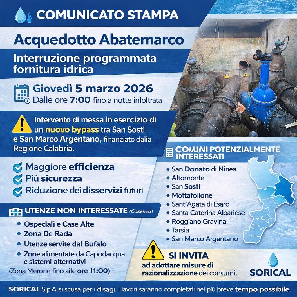 Una giornata di stop forzato per garantire l’efficienza della rete idrica nel lungo periodo. Sorical S.p.A. ha comunicato che giovedì 5 marzo, a partire dalle ore 7 e fino a notte inoltrata, sarà sospesa l’erogazione lungo lo schema dell’Acquedotto Abatemarco.