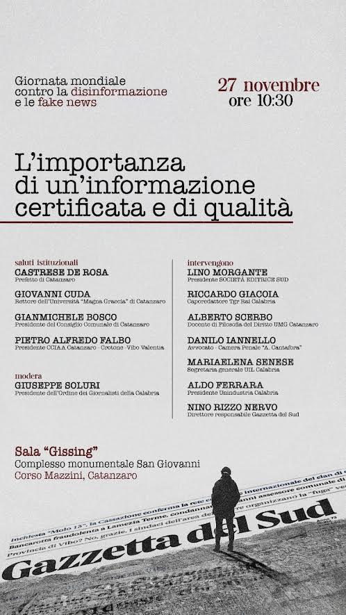 In occasione della Giornata nazionale contro la disinformazione e le fake news, il 27 novembre a Catanzaro si terrà l’incontro pubblico “L’importanza dell’informazione certificata e di qualità”. L’evento, ospitato nel Complesso monumentale San Giovanni a partire dalle 10:30, riunirà esponenti del mondo dell’informazione, dell’Università, delle professioni e delle istituzioni per discutere delle sfide legate alla circolazione incontrollata di notizie false.
