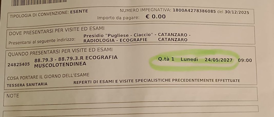 Fazio, già operato per l’inserimento di una protesi a una gamba, accusa oggi gravi problemi all’altro arto. Nonostante il medico abbia prescritto con carattere d’urgenza un’ecografia diagnostica, passaggio essenziale per evitare danni irreversibili, la risposta del Centro Unico di Prenotazione (CUP) è stata raggelante: l’appuntamento è disponibile solo a maggio 2027.